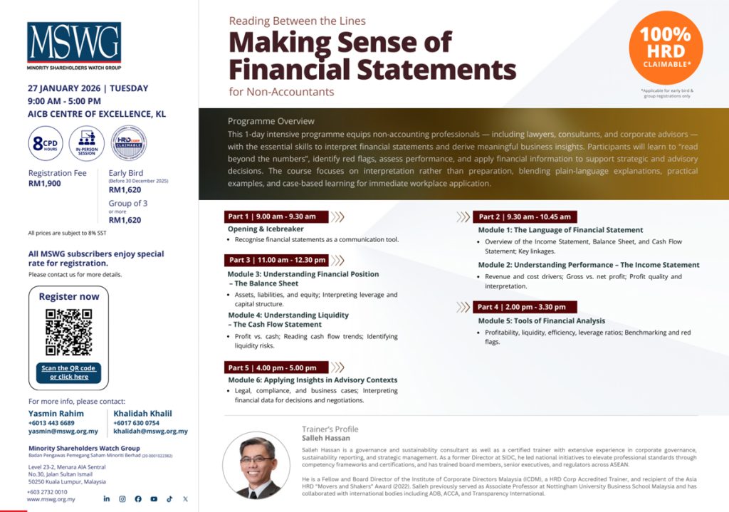 Our training programmes cater to directors, senior management, compliance officers, investors, and other stakeholders within the capital market ecosystem. The courses are grounded in real-world issues and guided by MSWG’s deep expertise in monitoring public-listed companies.